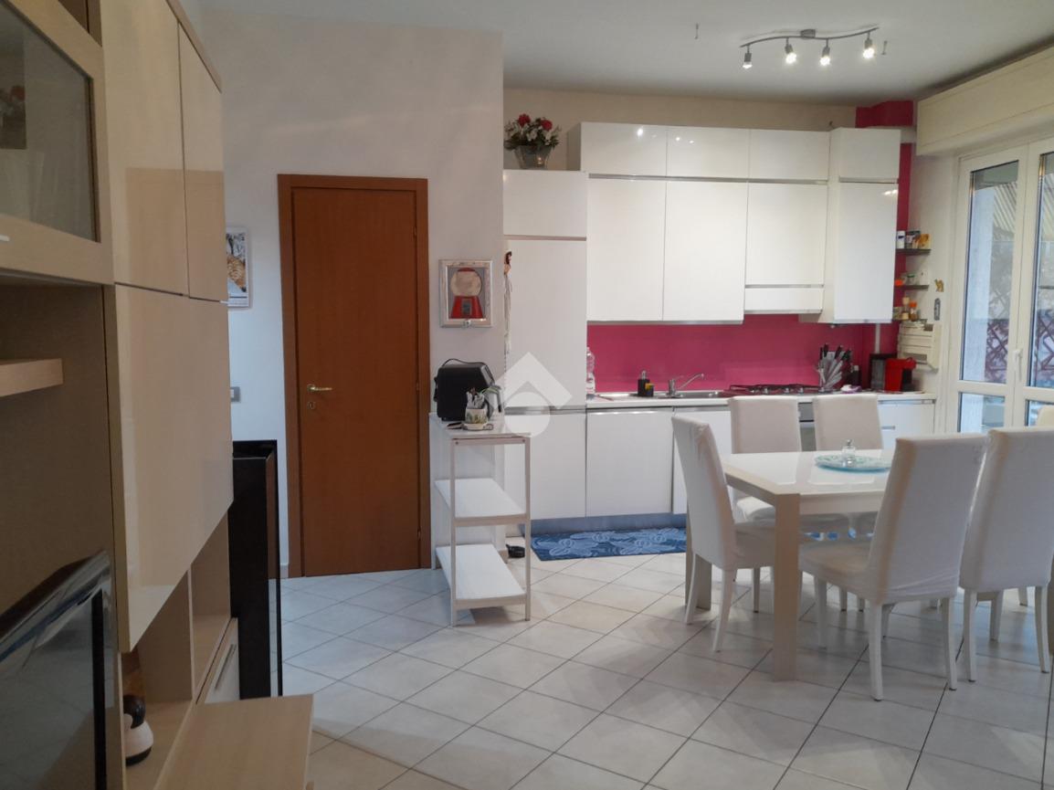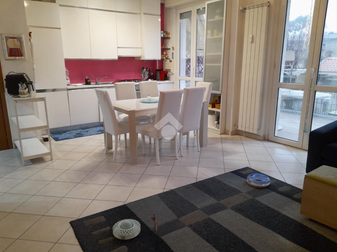 Il soggiorno con cucina a vista si apre su un terrazzo vivibile, ideale per momenti di relax all’aria aperta.