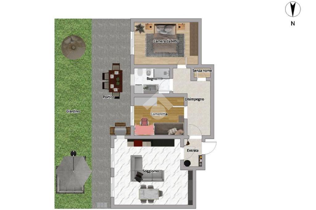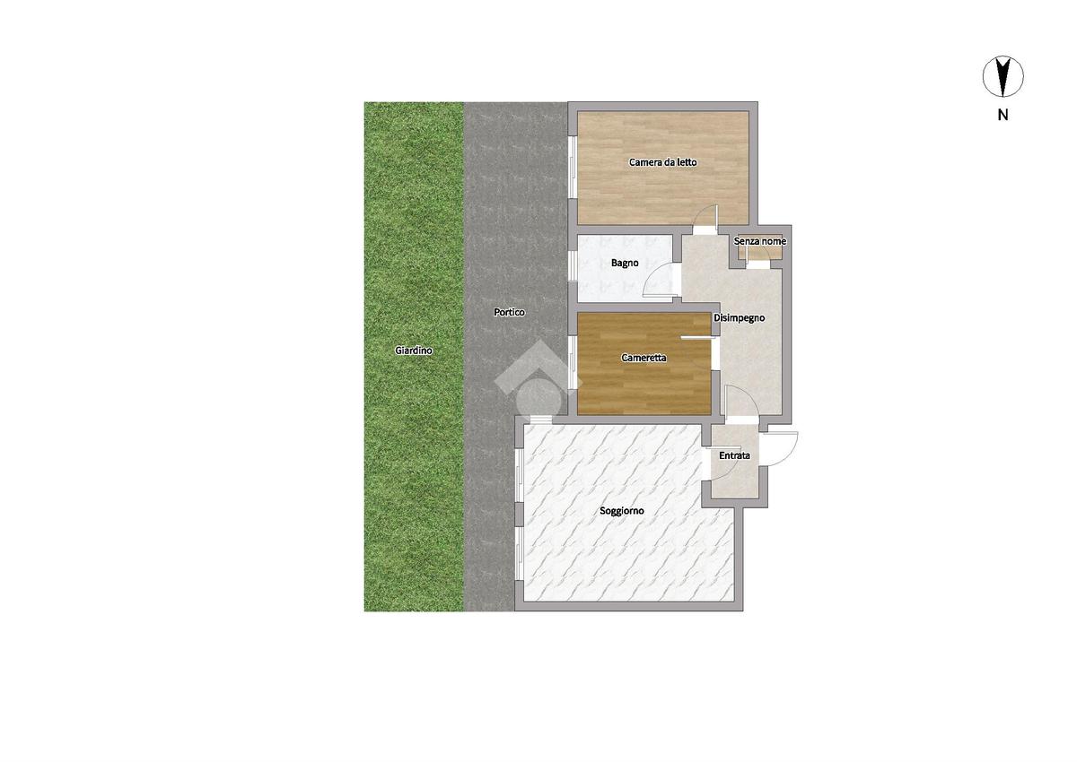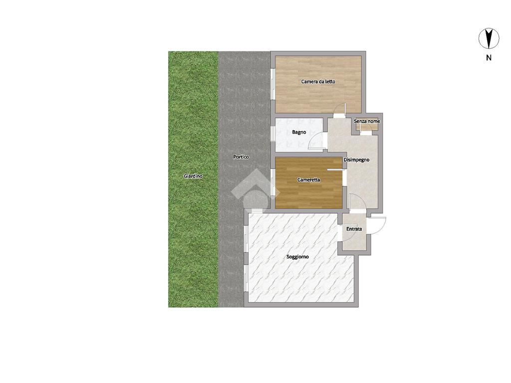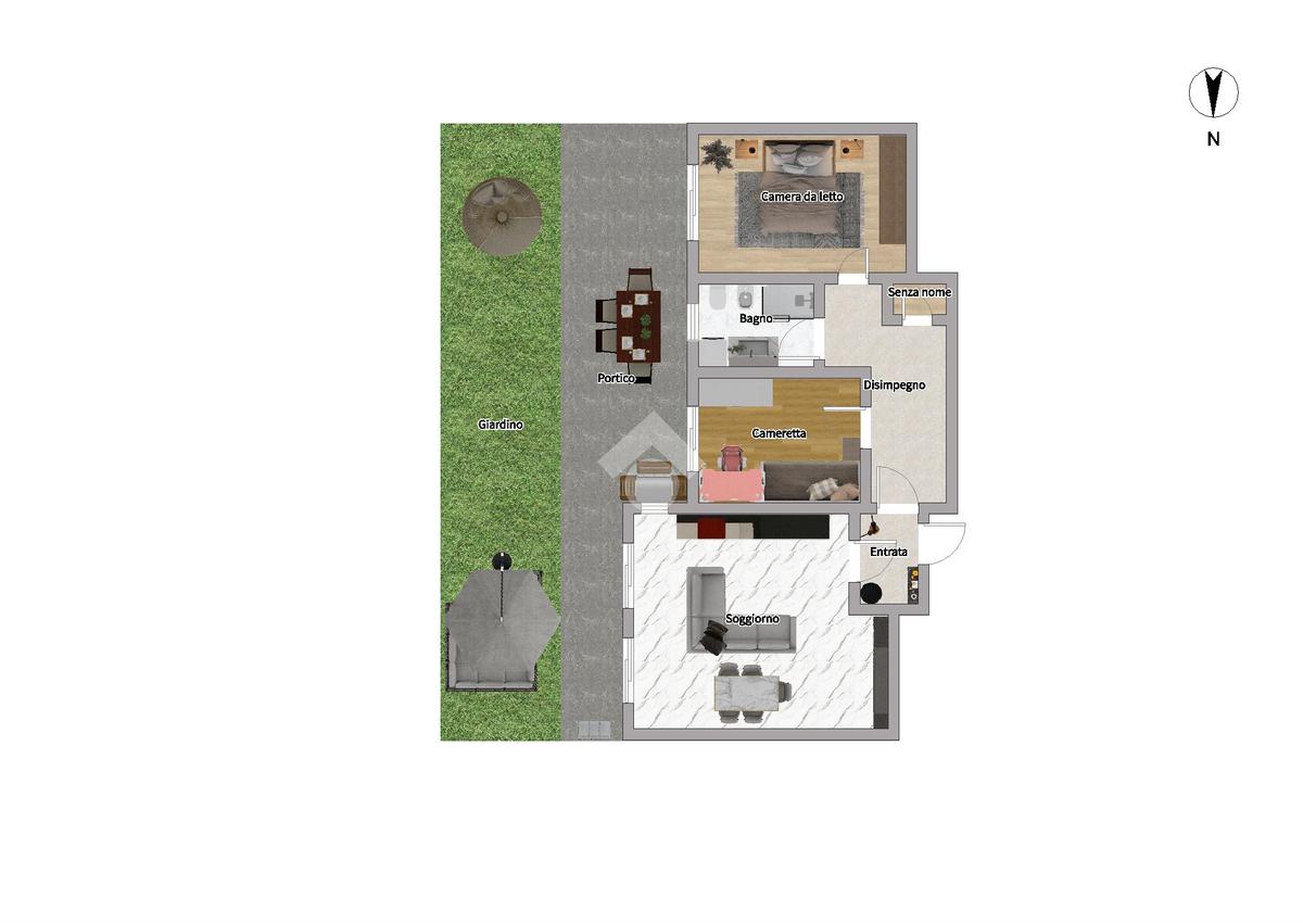 L'appartamento si compone di ingresso, soggiorno con cucina a vista che si affaccia su un portico di 25 mq con annesso giardino di 38 servizo finestrato, camera da letto e cameretta.