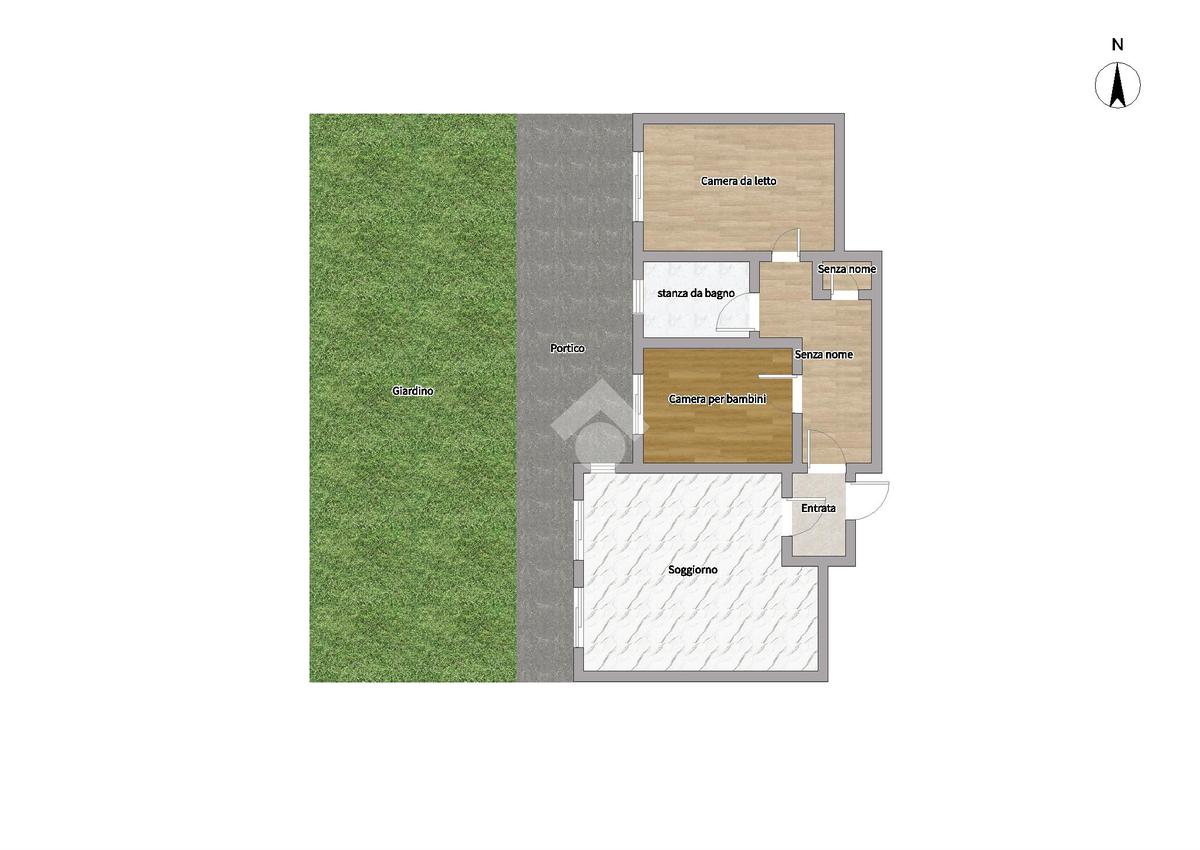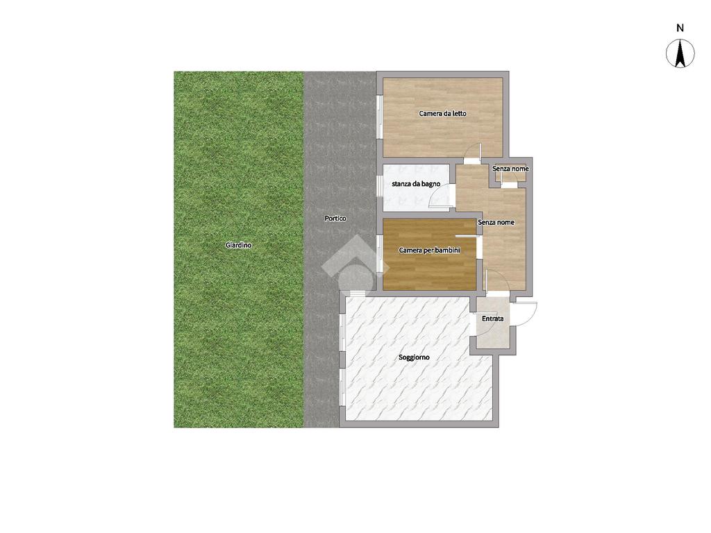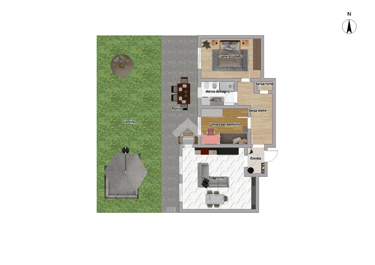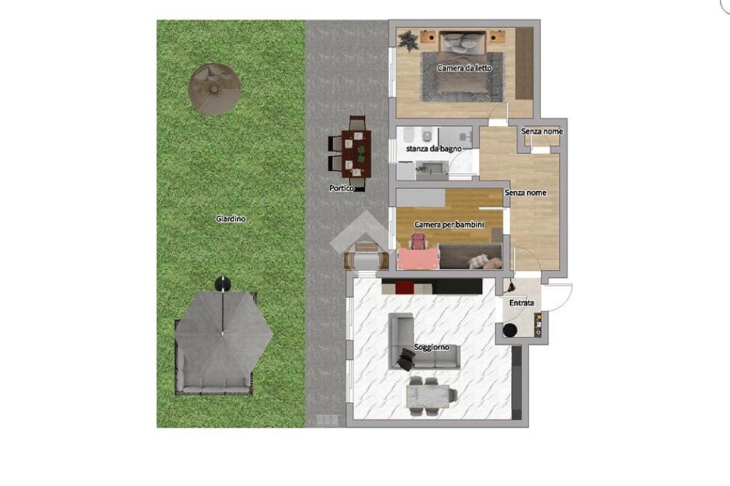 L'immobile è composto da Ingresso, soggiorno con cucina a vista, che si affaccia su un ampio portico di 25 mq e giardino privato di 62 mq, servizio, camera matrimoniale e cameretta.