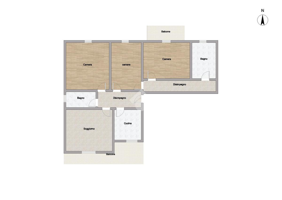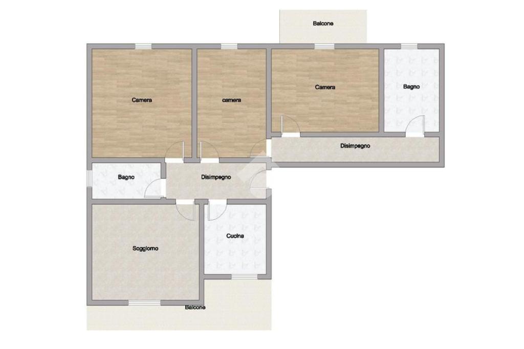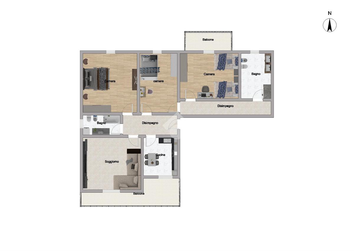 L'abitazione offre spazi ampi e ben distribuiti: l'ingresso conduce a un luminoso soggiorno, cucina abitabile, entrambi affacciano su un balcone con vista sul giardino condominiale. La zona notte comprende due camere matrimoniali, di cui una con balcone privato, oltre a una cameretta.