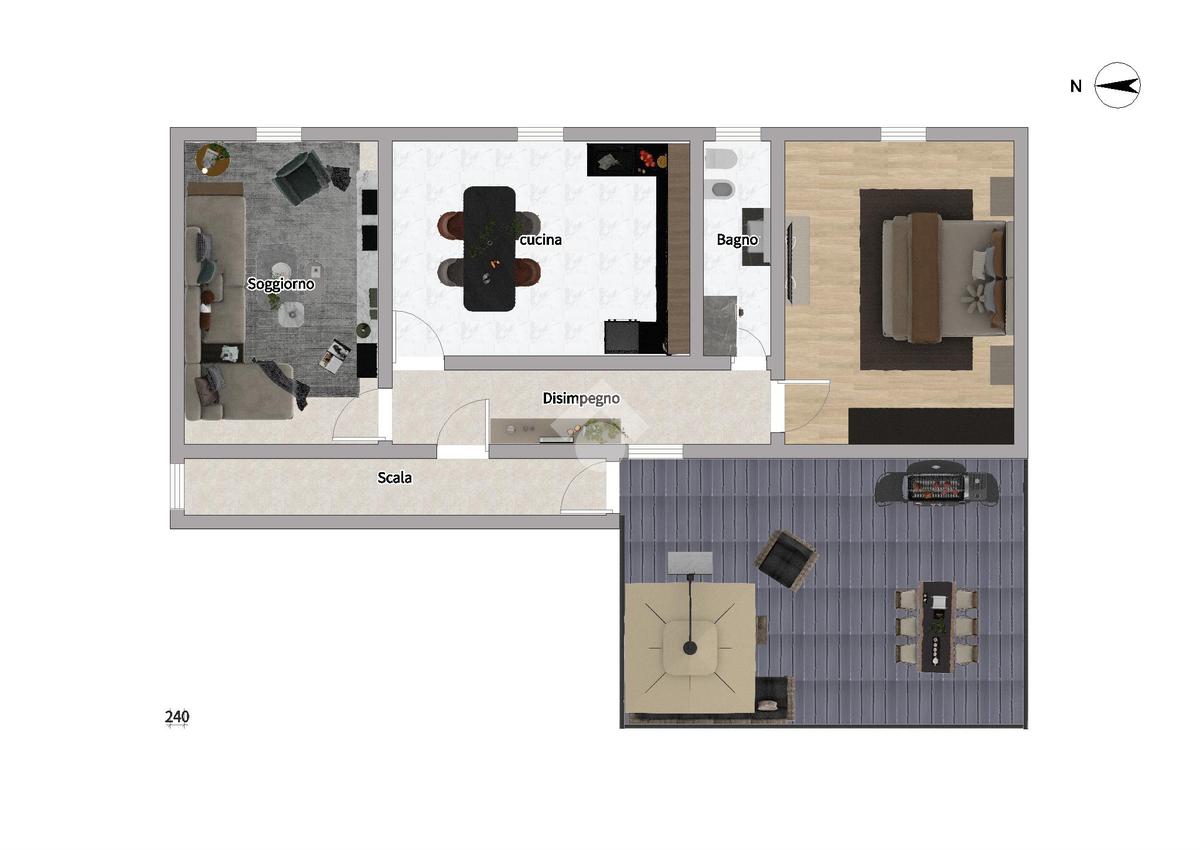 Il terrazzo, vero valore aggiunto della proprietà, rappresenta uno spazio perfetto per momenti di svago all’aperto, per cene estive o per creare una zona relax verde e riservata.